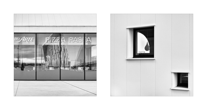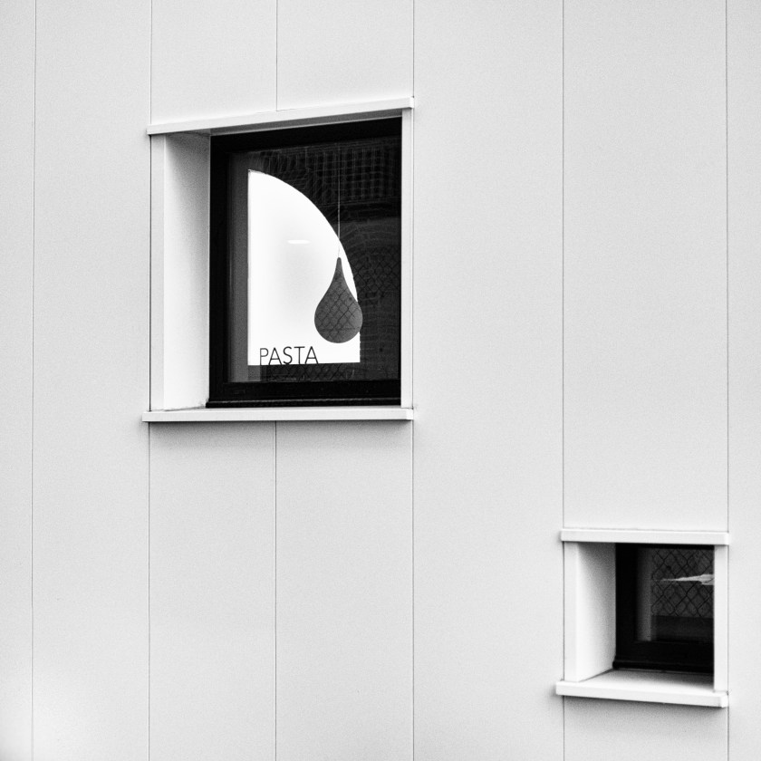 Les murs du restaurant del’Arte sont blancs, à peine sales. Quand j’aperçois le luminaire et l’inscription Pasta au travers de l’une des petites fenêtres du mur latéral, je suis séduit. L’image devra être redressée pour que les lignes soient bien verticales mais un mur avec ses fenêtres qui font penser à des tableaux accrochés dans un salon, c’est trop craquant.