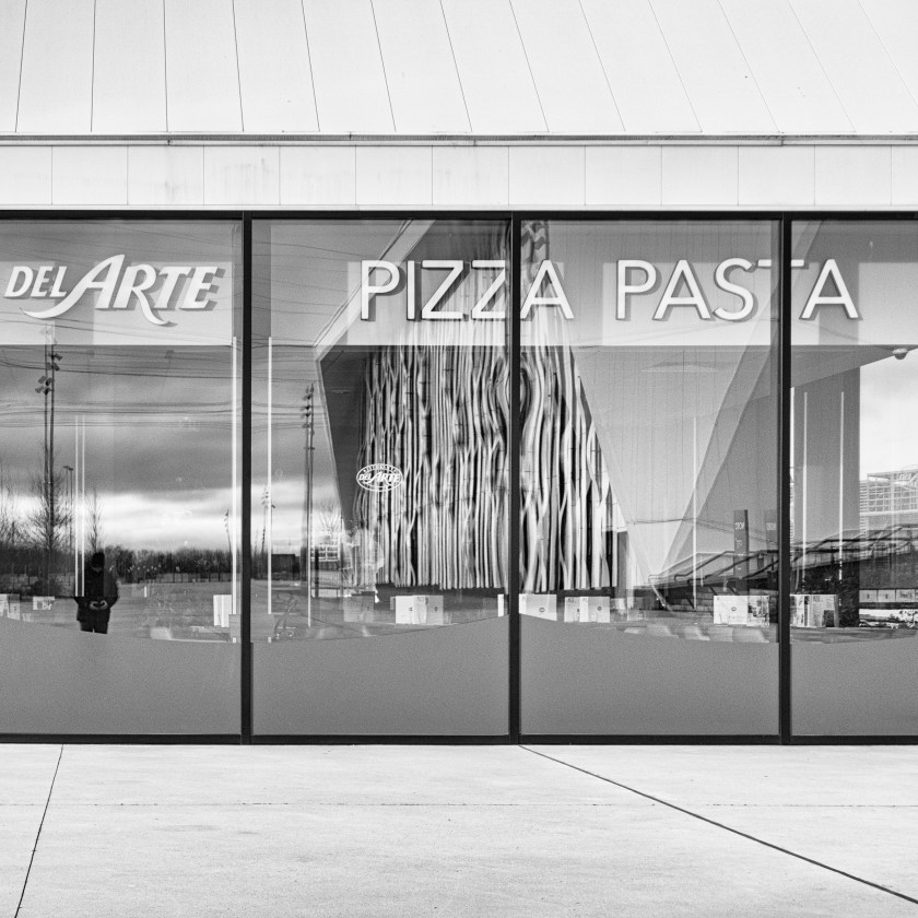 L’Aren’ice, la patinoire salle de spectacles, est voisine du restaurant. Je l’ai déjà photographiée par le passé. Je fais à nouveau quelques prises mais je constate que les reflets sur les vitres de del’Arte sont tout aussi dignes d’intérêt. En noir et blanc, si j’en crois ce que je vois sur l’écran de mon appareil, cela devrait bien rendre.