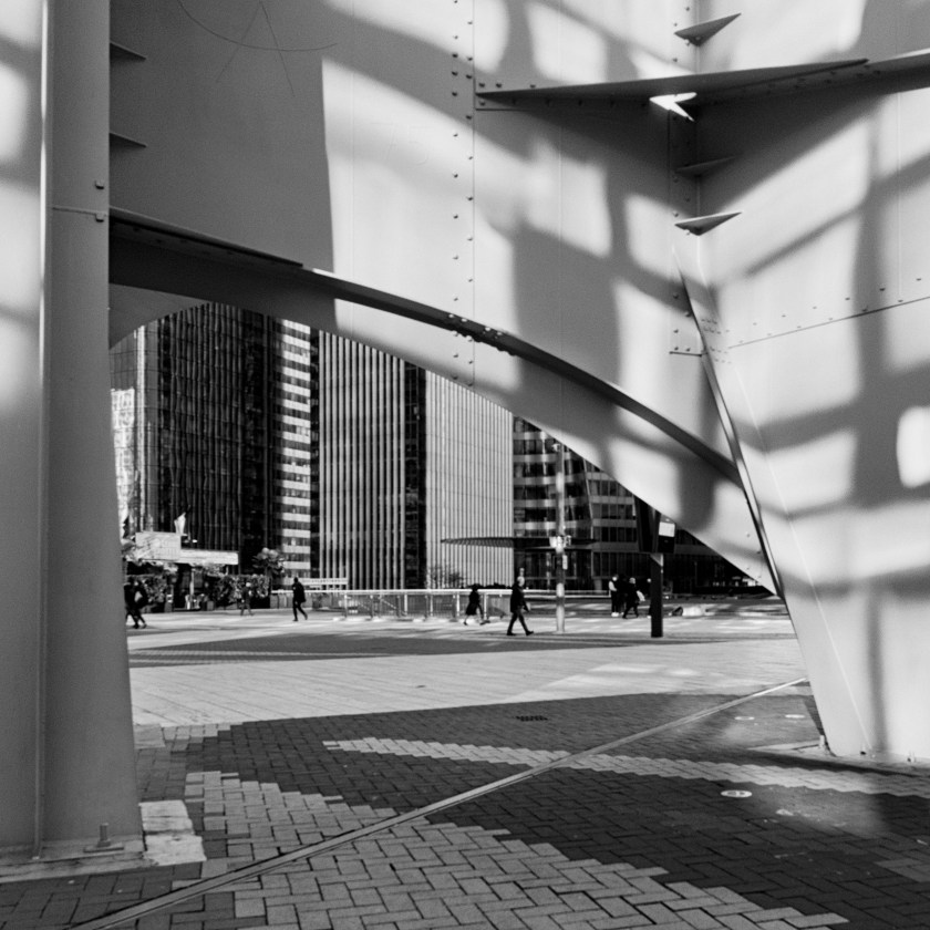 Évidemment, le plus intéressant à La Défense, ce sont les immeubles, la Grande Arche, les installations, Miró et Calder notamment. Du verre, de l’acier, du béton aussi, et des gens, partout, qui marchent d’un pas plus ou moins assuré, touristes ou Parisiens pressés. Et par-dessus tout, l’immensité des bâtiments. Comment saisir cela, comment le rendre? Ça ne rentre pas. Mon 24 mm est bien impuissant face à ces tours trop grandes pour lui. J’apprendrai vite que, comme pour un paysage, les détails —que j’appellerai ainsi faute d’un terme plus approprié— permettent de restituer la grandeur d’un lieu mieux qu’une vue faite avec un UGA.