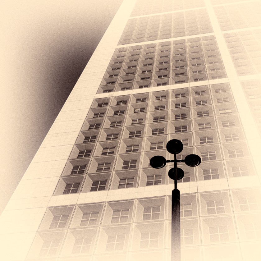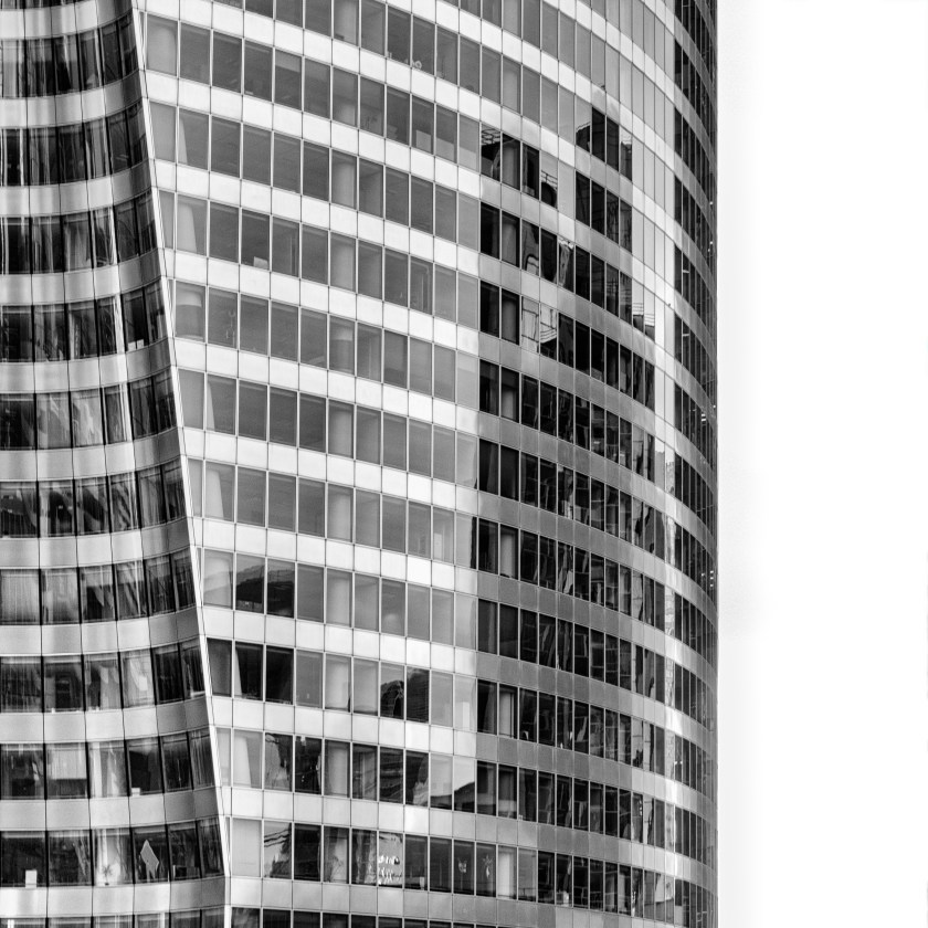 Je ne suis pas un spécialiste de la photographie d’architecture mais je sais qu’il faut respecter les verticales, ou alors s’en écarter franchement pour montrer au regardeur qu’il s’agit d’une intention assumée par le photographe. Presque toutes mes images prises à La Défense seront redressées; c’est indispensable.
