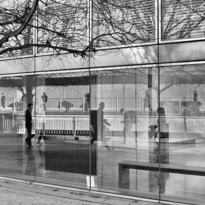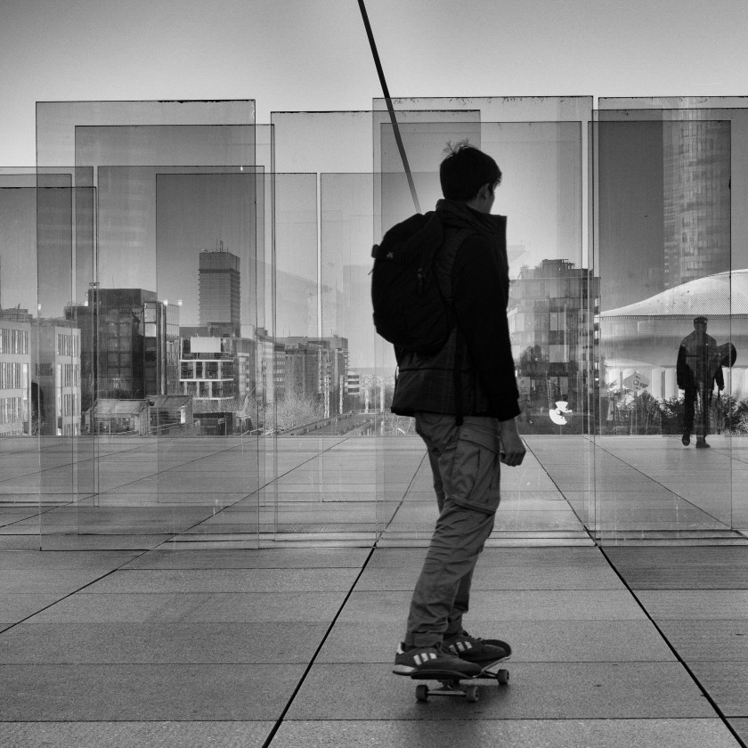 Sur la dalle se trouvent des panneaux de verre en quinconce. Je ne connais pas leurs fonctions précises. Ils participent je pense à bloquer les courants d’air, comme la voile blanche au-dessus. Peut-être servent-ils aussi à réguler le passage. Face à ces panneaux aux reflets fascinants, j’attends mon sujet: un ou des passants qui voudront bien passer tout près devant moi. J’ai beaucoup de chance avec ce skater. Je ne l’ai pas vu venir mais j’arrive à le capter, qui plus est bien placé dans le cadre. Après réflexion je me dis que je dois améliorer ma technique de prise de vues quand je suis en mode photo de rue. Par exemple, sélectionner préalablement le mode rafale.