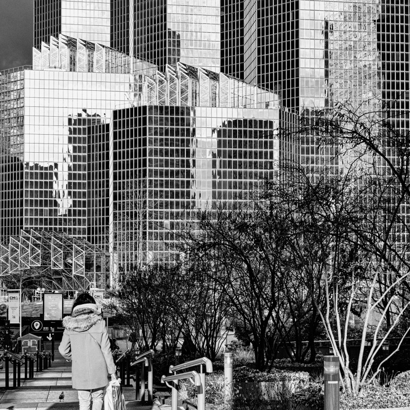 J’ai vu beaucoup de choses. J’ai pris plein de photos. Et pourtant il reste tant à voir. Je retournerai à La Défense, je monterai en haut de la Grande Arche. J’explorerai les abords. En été, je photographierai les jets d’eau. Le Centre commercial Westfield-Les quatre temps ne manque pas d’intérêt non plus. Là on est plutôt dans la street photography. Il faudrait que je m’y mette; encore un projet à mener. Dans l’immédiat, j’ai d’autres intentions, d’autres lieux de la capitale en vue. Moins gigantesques pour sûr.