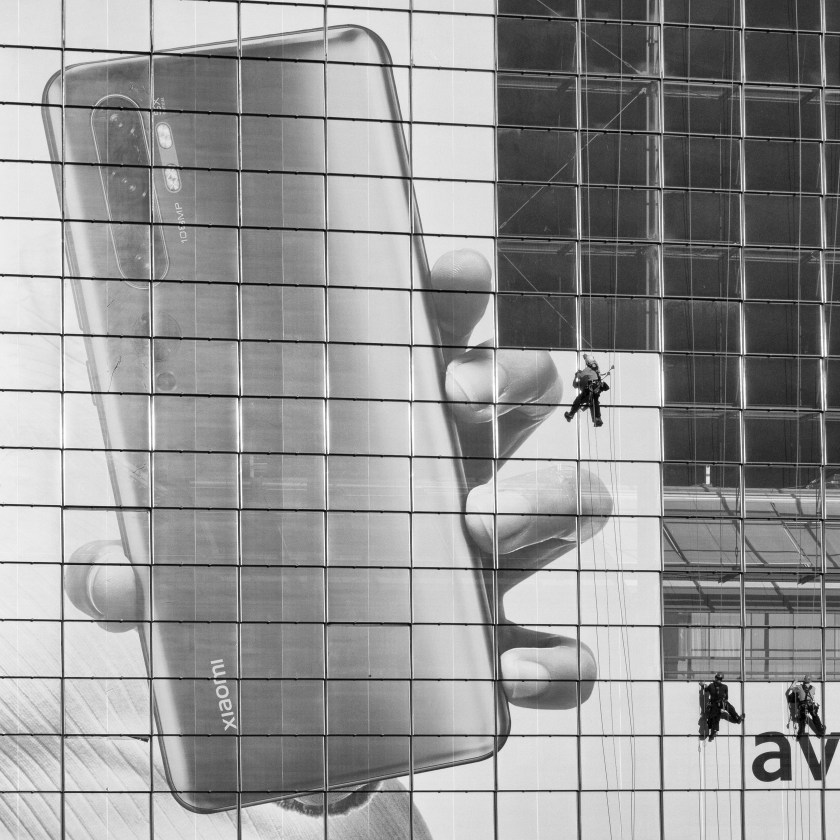 Jeudi après-midi, je remarque que la façade du cnit a changé. Des ouvrier•res décollent les panneaux de la publicité géante du dernier téléphone xiaomi. Trois objectifs, images de 108 mégapixels… Je mitraille. Des plans plus ou moins larges. Au cours du post-traitement, je retiendrai l’image qui suit parce que les trois personnages sont clairement identifiables sur le fond blanc. Ces trois figurines fournissent la clé de l’image, son échelle et surtout comme on ne les remarque pas immédiatement elles contribuent à un effet de surprise.